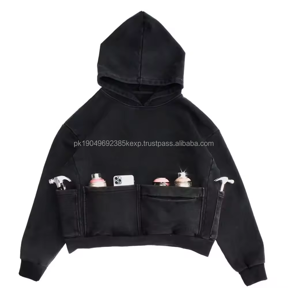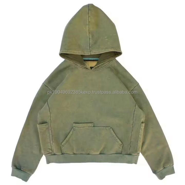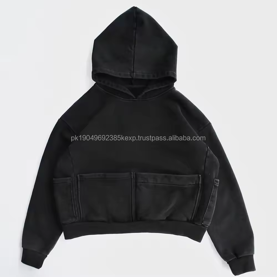 เสื้อฮู้ดดี้ผู้ชายสไตล์สตรีทแบบเรียบง่าย มีหลายกระเป๋า ทรงโอเวอร์ไซส์ เสื้อฮู้ดดี้สตรีทแวร์แบบเรียบๆ ผ้าหนา ล้างสีแบบเอซิดวอช