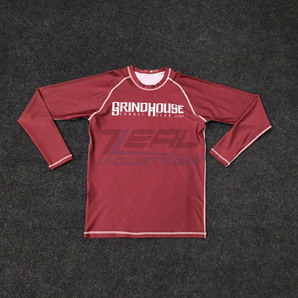 MMA เสื้อแรชการ์ดพิมพ์ซับลิเมชันกำหนดเอง240ป้องกันอัลทวอยเลต์ GSM การบีบอัดการต่อสู้แบบผดผื่น BJJ ผลิตในปากีสถาน