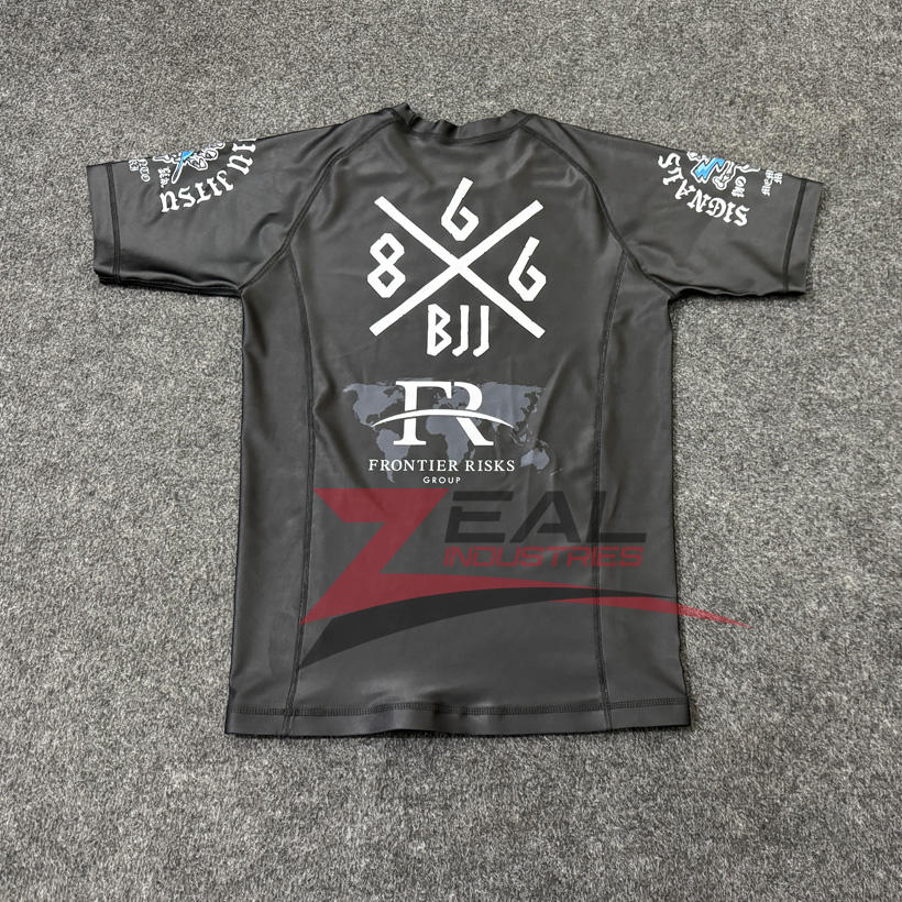เสื้อแรชการ์ด BJJ พิมพ์ซับลิเมชันชันออกแบบได้ตามต้องการป้องกันแบบ240gsm พิมพ์ลายอัลตออลตาอเลต