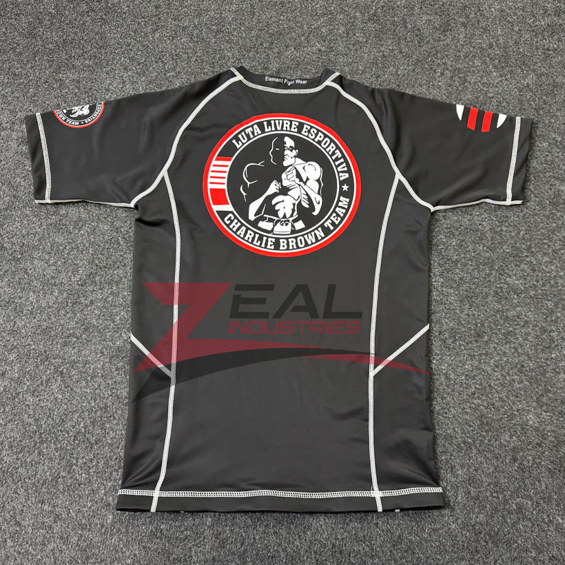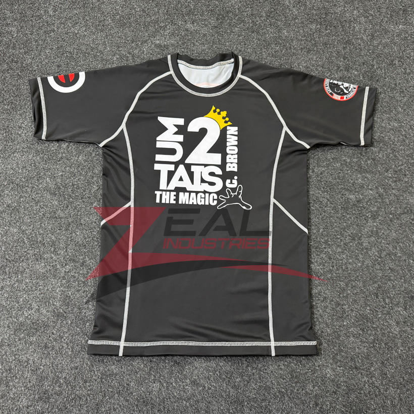 เสื้อแรชการ์ด BJJ พิมพ์ซับลิเมชันชันออกแบบได้ตามต้องการป้องกันแบบ240gsm พิมพ์ลายอัลตออลตาอเลต