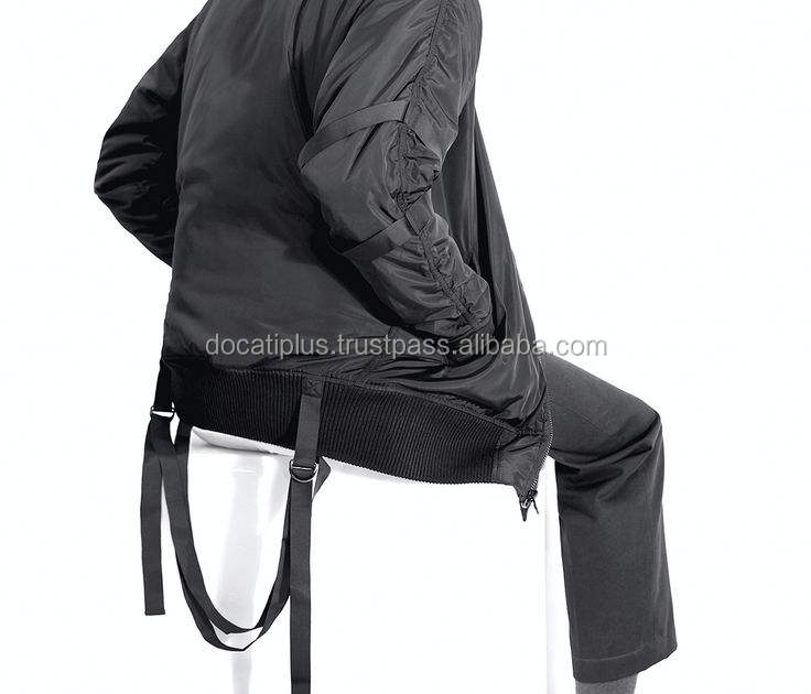 แจ็คเก็ตบอมเบอร์สีดำแบบมีสายรัดสำหรับผู้ชาย ผลิตตามสั่ง (OEM)