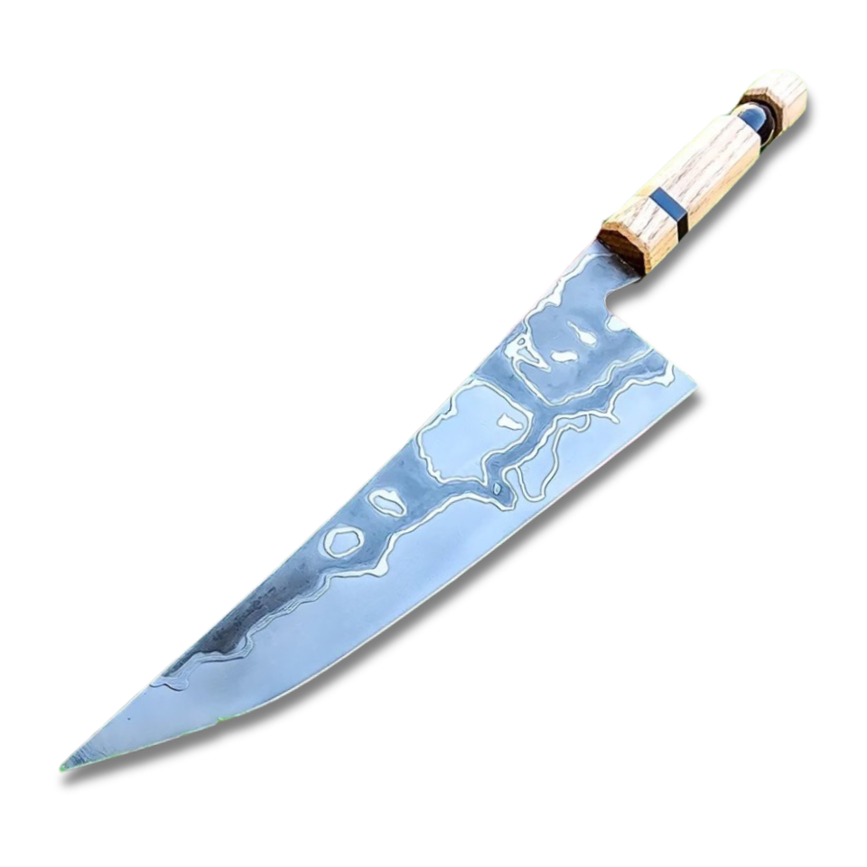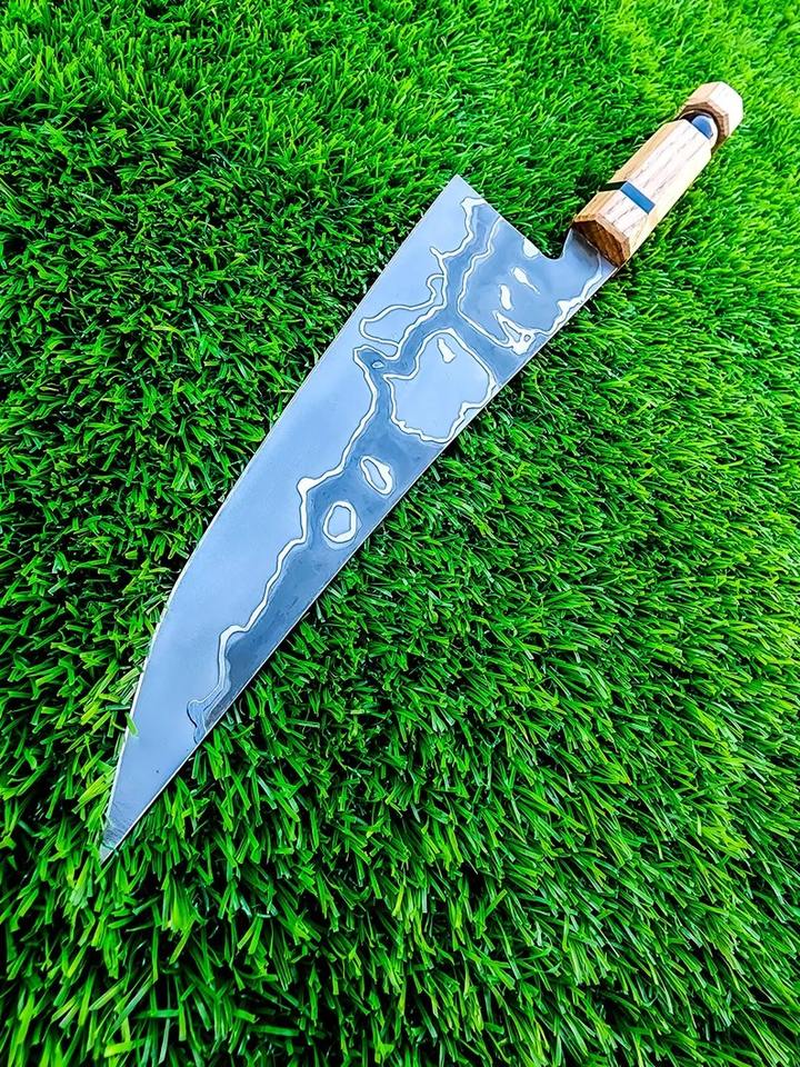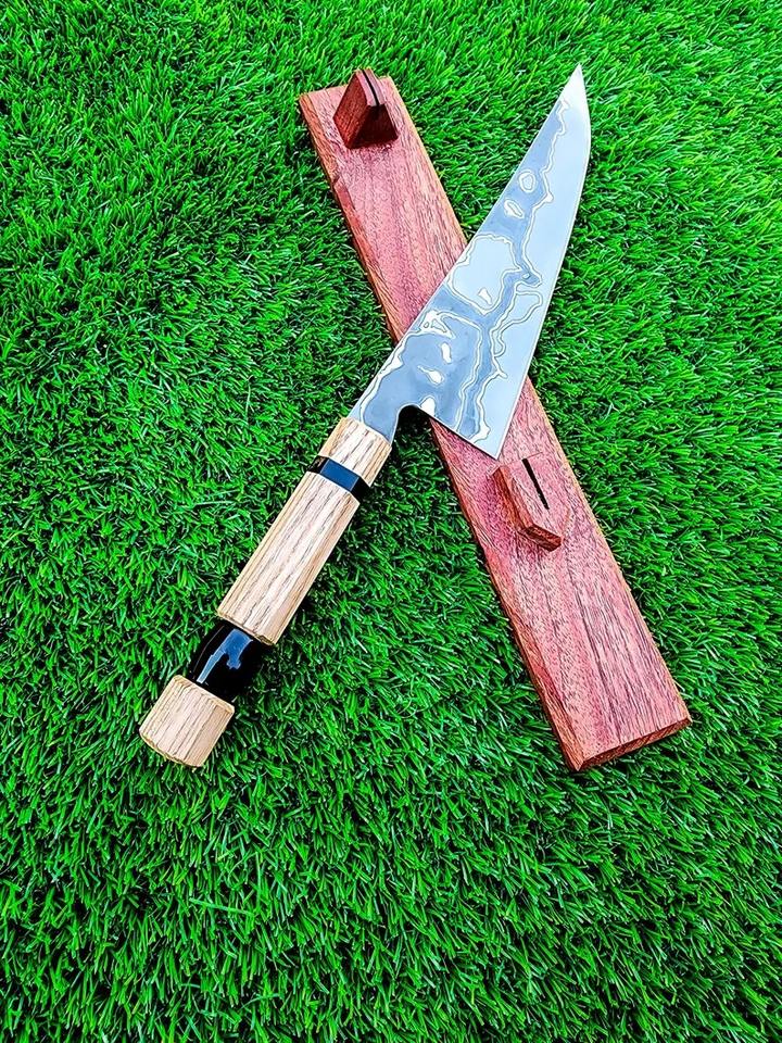 มีดเชฟเหล็กกล้าคาร์บอนทำมือ ใบมีดสลักลายสวยงาม ด้ามไม้ดีไซน์สวย พร้อมปลอกหนัง มีดสั่งทำพิเศษหรือมีดเอาตัวรอด