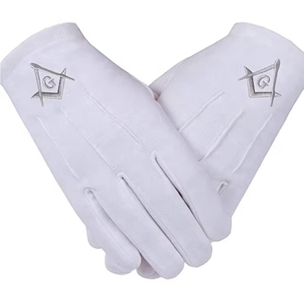 ถุงมือเมสันสีขาว ปักโลโก้รูปวงเวียนและเข็มทิศ ถุงมือผ้าฝ้าย ฟรีเมสัน ถุงมือเมสัน