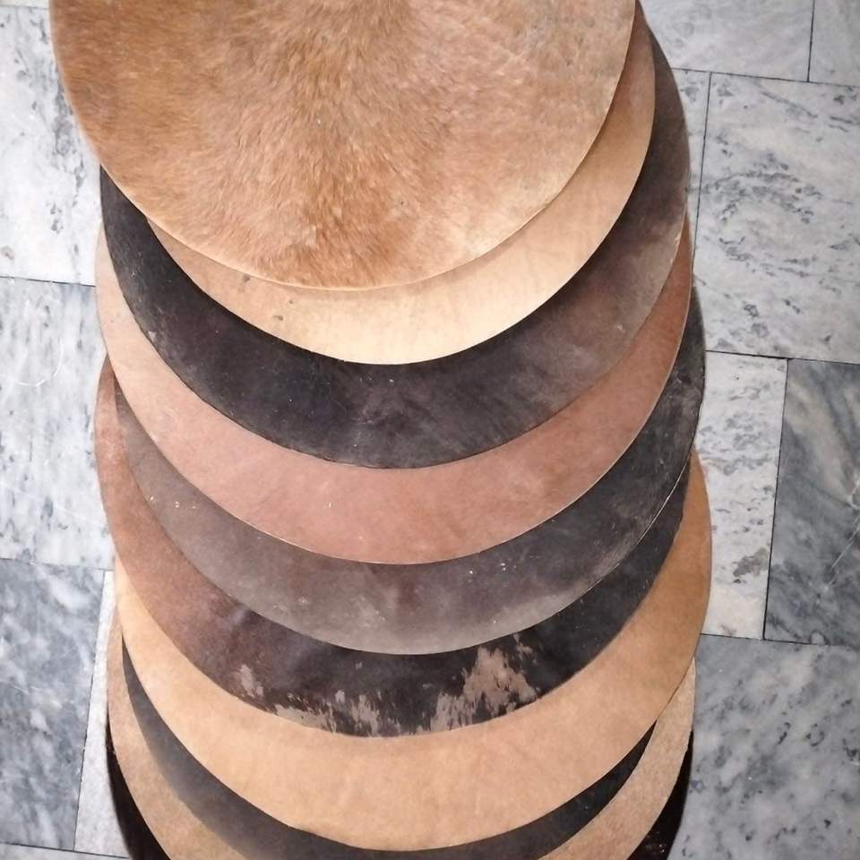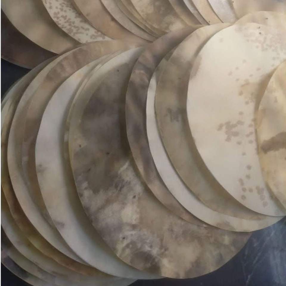 แสดงหนังสัตว์ดิบธรรมชาติที่ไม่ผ่านการฟอกสี เช่น หนังแพะหรือหนังควาย ซึ่งใช้ทำหนังกลอง