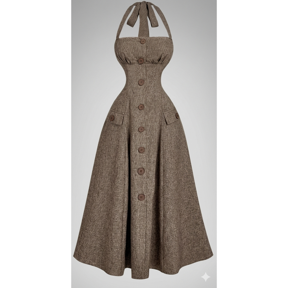 กระโปรงทรงนาฬิกาทรายแบบมีจีบเอว คอเสื้อแบบผูกเชือก ความยาวระดับกลาง พร้อมกระเป๋าข้างแบบฝาปิดสองช่อง