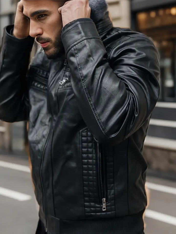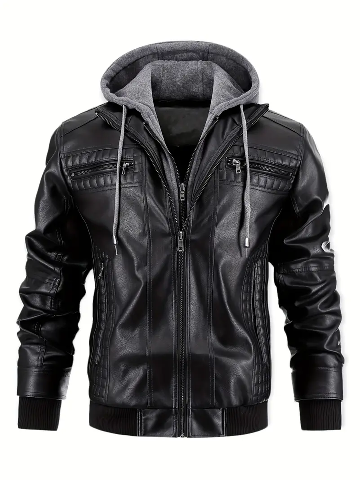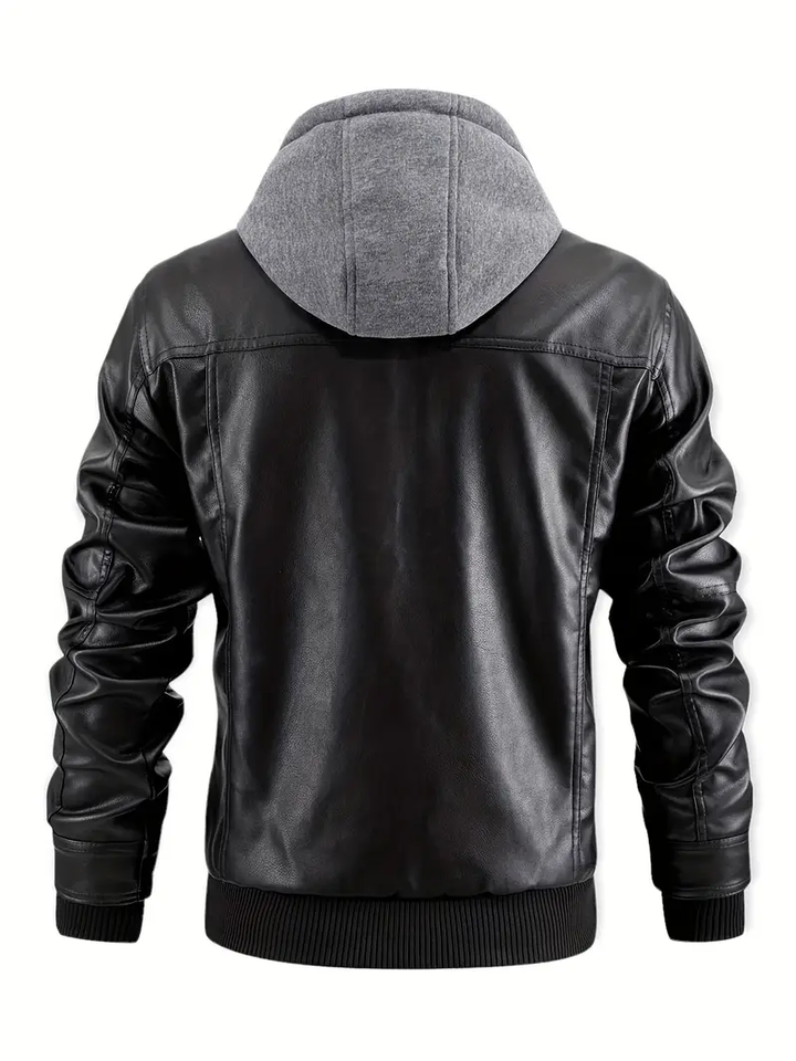 แจ็คเก็ตบอมเบอร์สไตล์เรโทรสำหรับผู้ชาย สีดำมีฮู้ด ปรับสายรูดได้ ซิปหลายช่อง