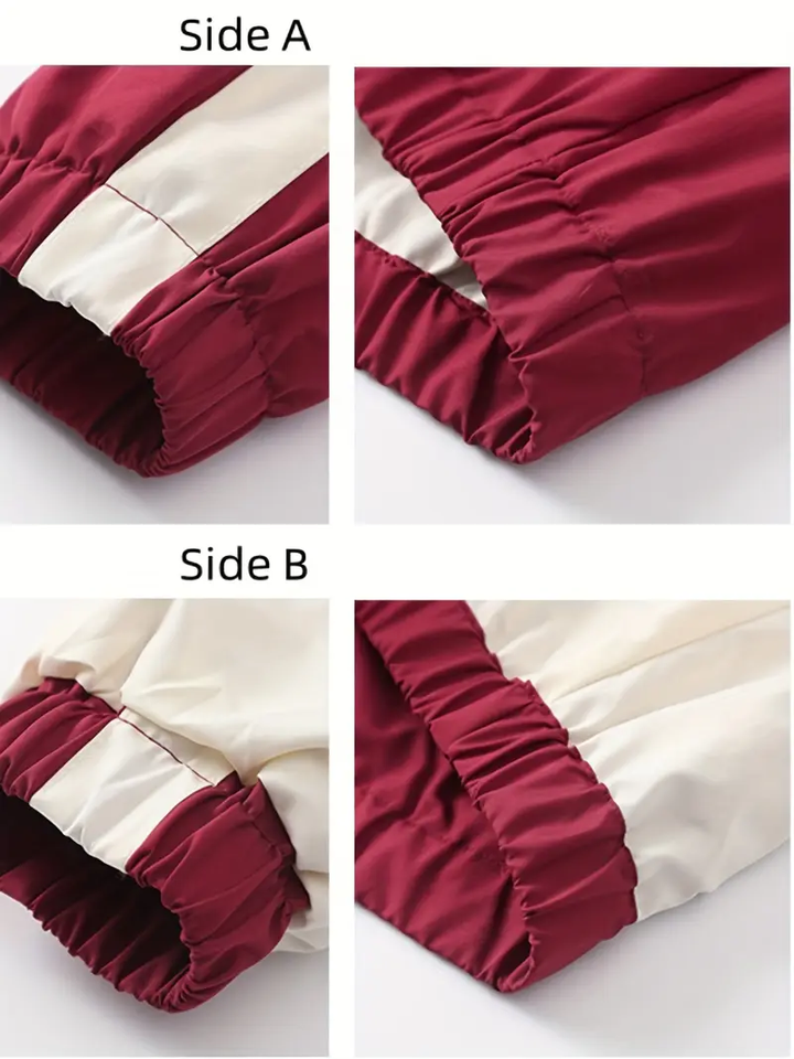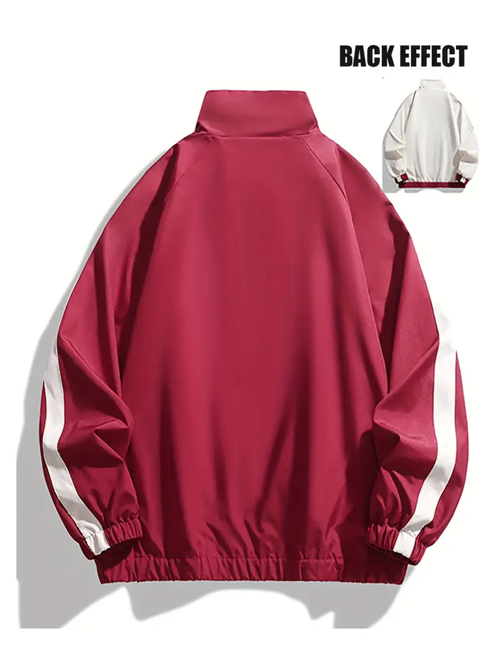 เสื้อแจ็คเก็ตโพลีเอสเตอร์แบบย้อนกลับคอตั้งสไตล์กีฬาผ้าบล็อกสีไม่ยืดมีซิปทรงหลวม