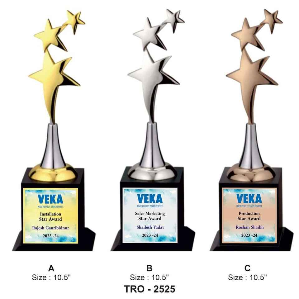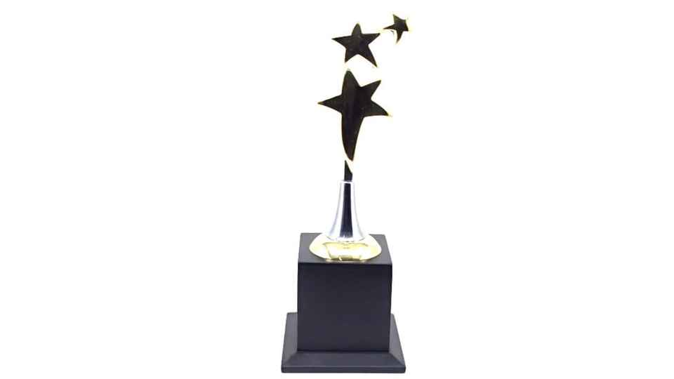 รางวัลรูปทรงโค้งสองดาว ดีไซน์สวยงาม พร้อมผิวสัมผัสโลหะและฐานที่มั่นคง สำหรับมอบรางวัลเกียรติยศด้านความสำเร็จทางธุรกิจ