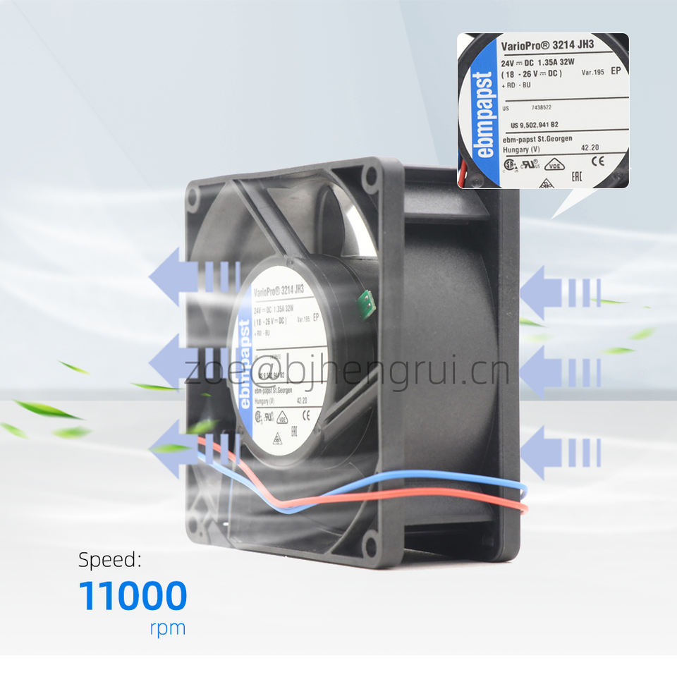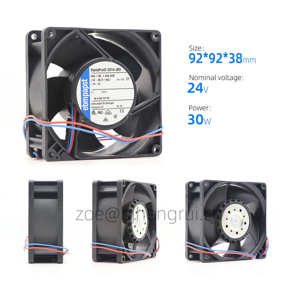 พัดลมระบายความร้อนแบบแกน ebmpapst รุ่น 3214JH3 DC 24V 140CFM 69dBA ขนาด 92x92x38 มม. 9238 9 ซม. แบบลูกปืนพร้อมสายไฟ สำหรับอินเวอร์เตอร์ รุ่น 3214JH3-195