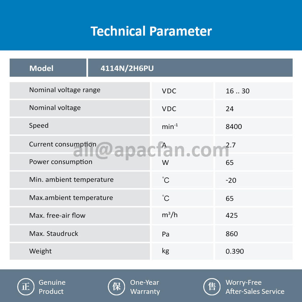 สำหรับ4114N-2H6PU 120x120x38มม. 12038 24VDC 65วัตต์2.7A 8400รอบต่อนาที425m 3 /h ลูกปืนใบพัดพลาสติก DC พัดลมระบายความร้อนตามแนวแกน