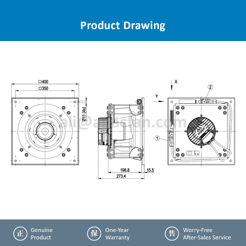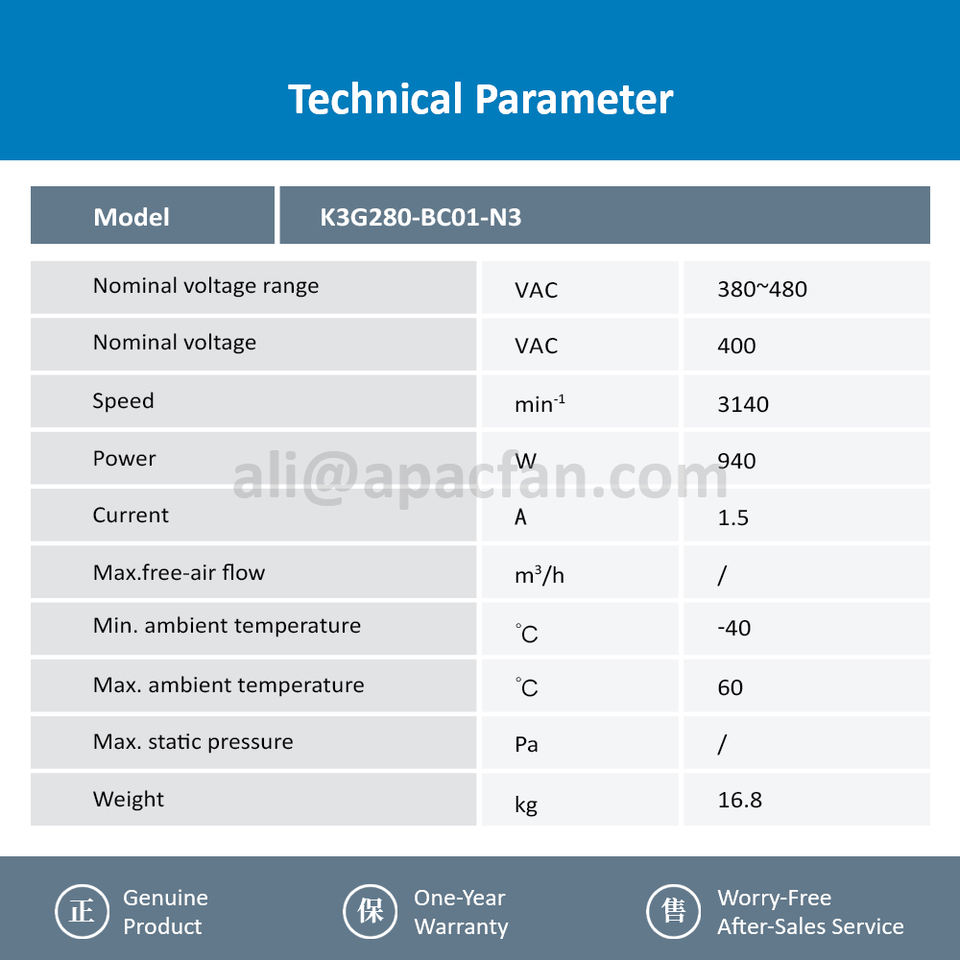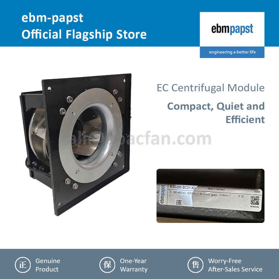 Ebmpapst K3G280-BC01-N3 400V AC 940W 1.5A 3140RPM แกนหมุนเซอร์โวมอเตอร์ติดตามแผงโซลาร์เซลล์พัดลมระบายความร้อนในตู้แรงเหวี่ยง