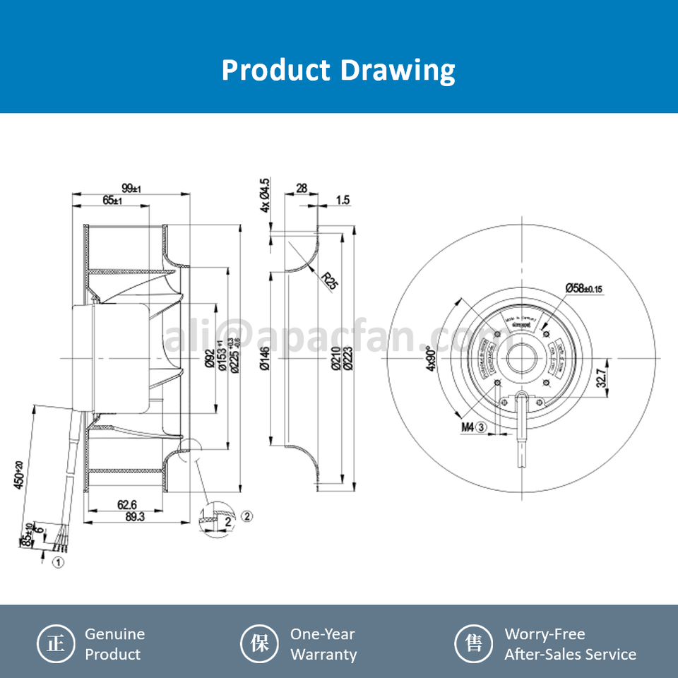 R1G225-AF11-52 ebmpapst 48VAC 225มม. 95วัตต์2.2A 2700รอบต่อนาที EC พัดลมระบายความร้อนแบบแรงเหวี่ยงในตู้