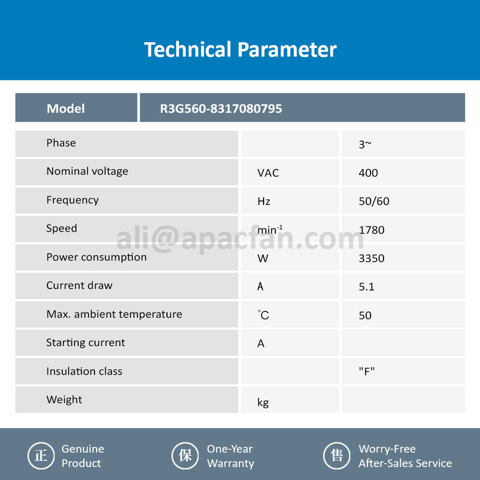 สำหรับ R3G560-8317080795 400VAC 3350W 5.1A AHU ชุดจัดการอากาศ เครื่องปรับอากาศความแม่นยำสูง ระบบทำความเย็น OEM/ODM พัดลมแบบแรงเหวี่ยง