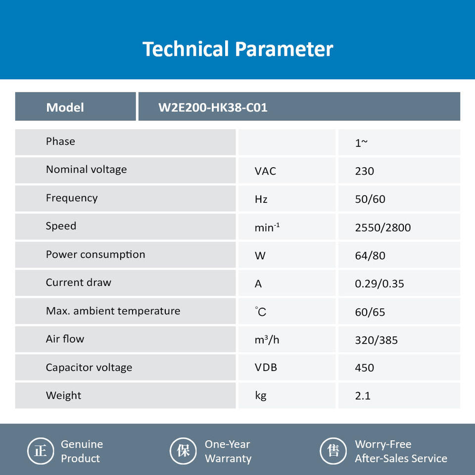 สำหรับ W2E200-HK38-C01 230VAC 2550/2800RPM 64/80W 0.29/0.35A ตู้อินเวอร์เตอร์ไฟฟ้าโซลาร์เซลล์พัดลมระบายความร้อนตามแนวแกน