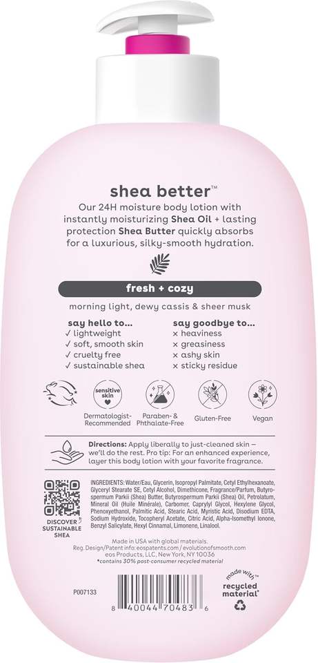 อีโอส ชี โลชั่นบำรุงผิวกายสำหรับผิวแพ้ง่าย, ชุ่มชื้นยาวนาน 48 ชั่วโมง, ปราศจากน้ำหอม, สำหรับผิวแห้ง, บรรเทาอาการผื่นคันจากโรคผิวหนังอักเสบ, ผลิตภัณฑ์วีแกน, 16 ออนซ์