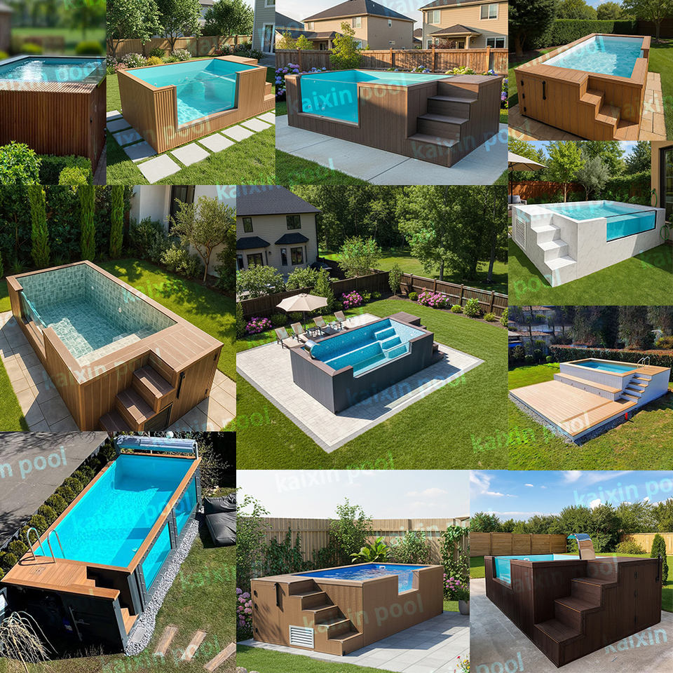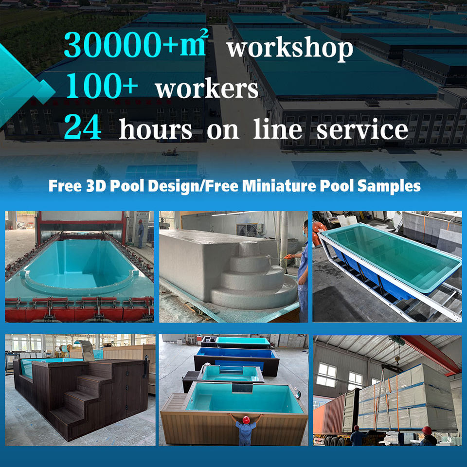 สระว่ายน้ำไฟเบอร์กลาสกลางแจ้งราคาโรงงานถูก พร้อมหน้าต่างกระจก สีดำ พื้นไม้ สำหรับครอบครัว ผลิตในจีน