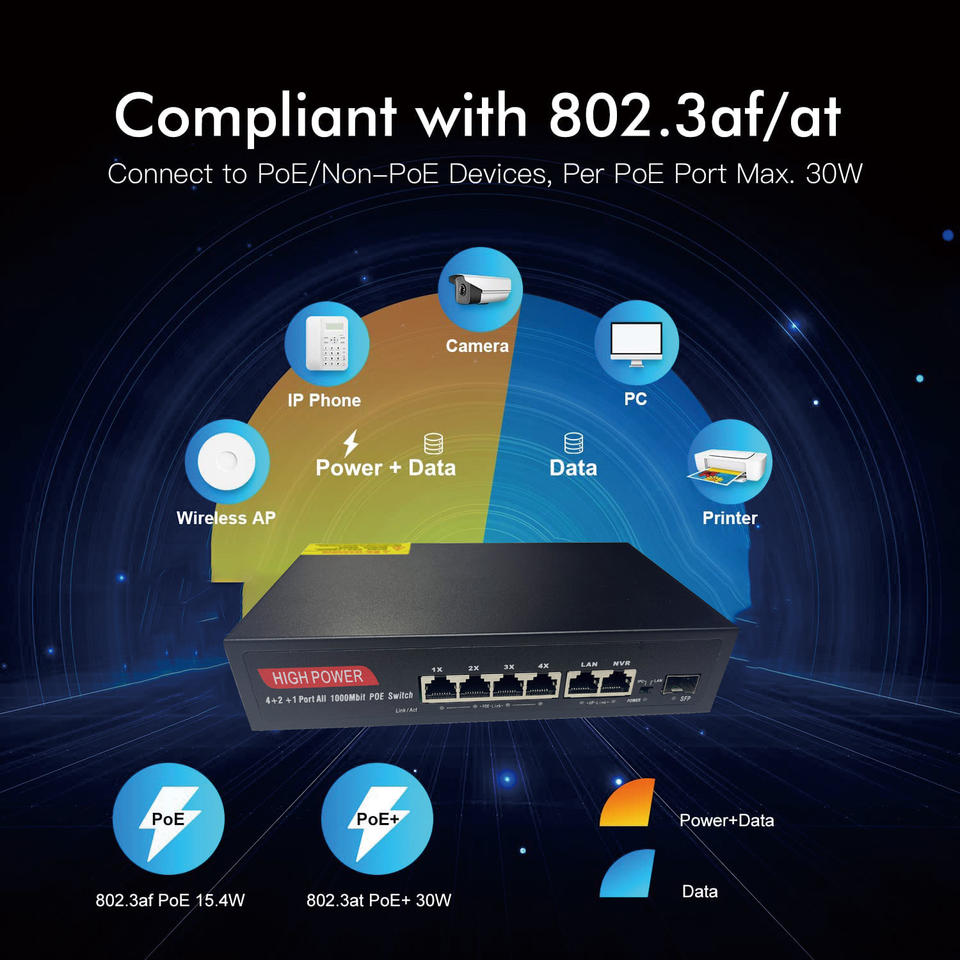 LACP, POE, QoS, SNMP, วางซ้อนกันได้, สนับสนุน VLAN
