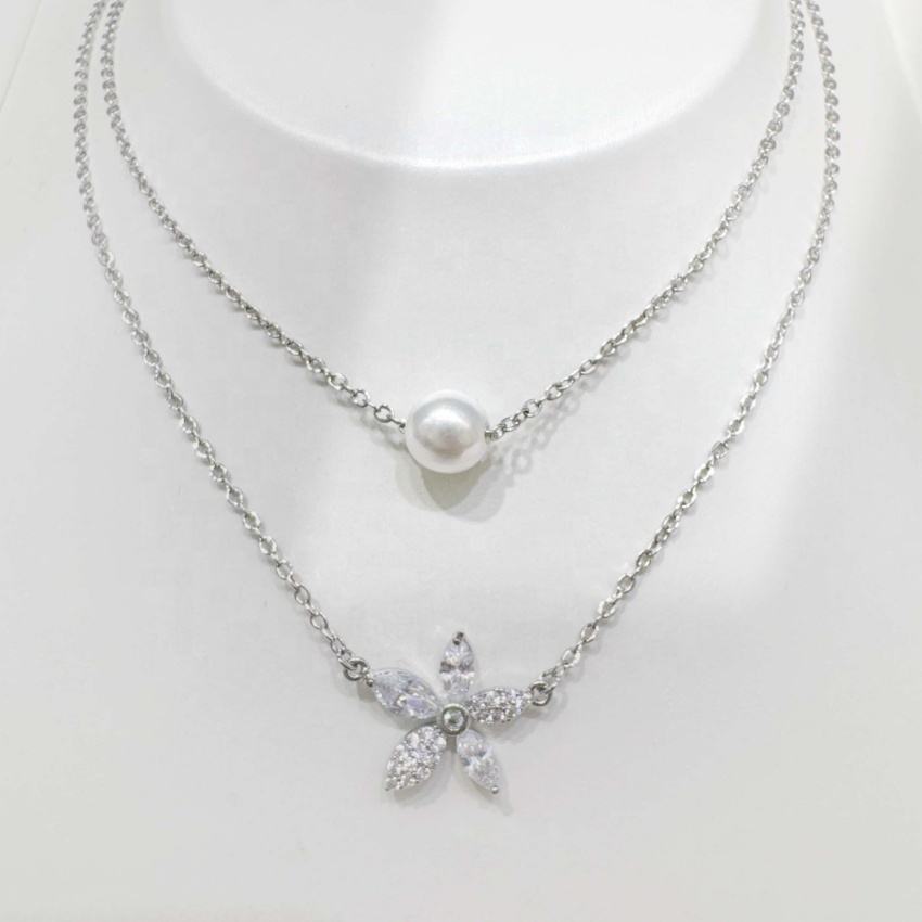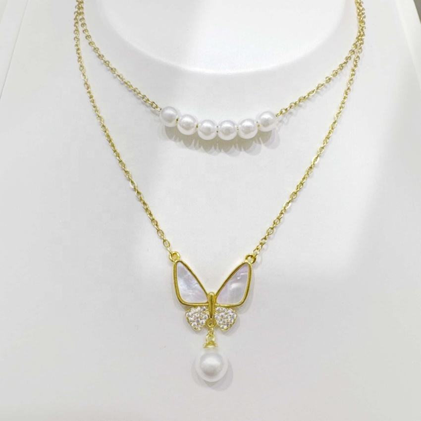 สร้อยคอแฟชั่นชุบทองคำขาวแท้ 925 ราคาโรงงาน ดีไซน์วินเทจ รูปดอกไม้ ผีเสื้อ มุก สำหรับผู้หญิง แบบหลายชั้น