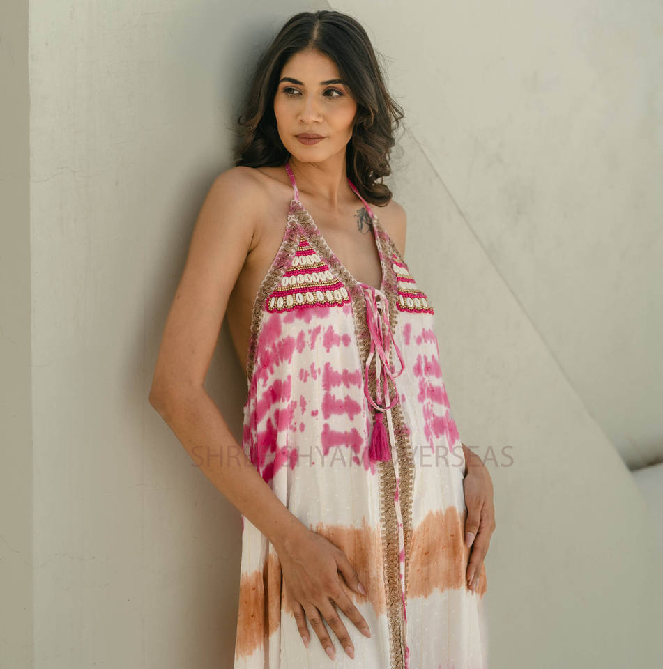 ชุดเดรสยาวผ้าเรยอนหลากสีสำหรับใส่ไปทะเลช่วงฤดูร้อน แบบไม่มีแขน ผ่าข้าง ปิดมิดชิด คอแบบผูก