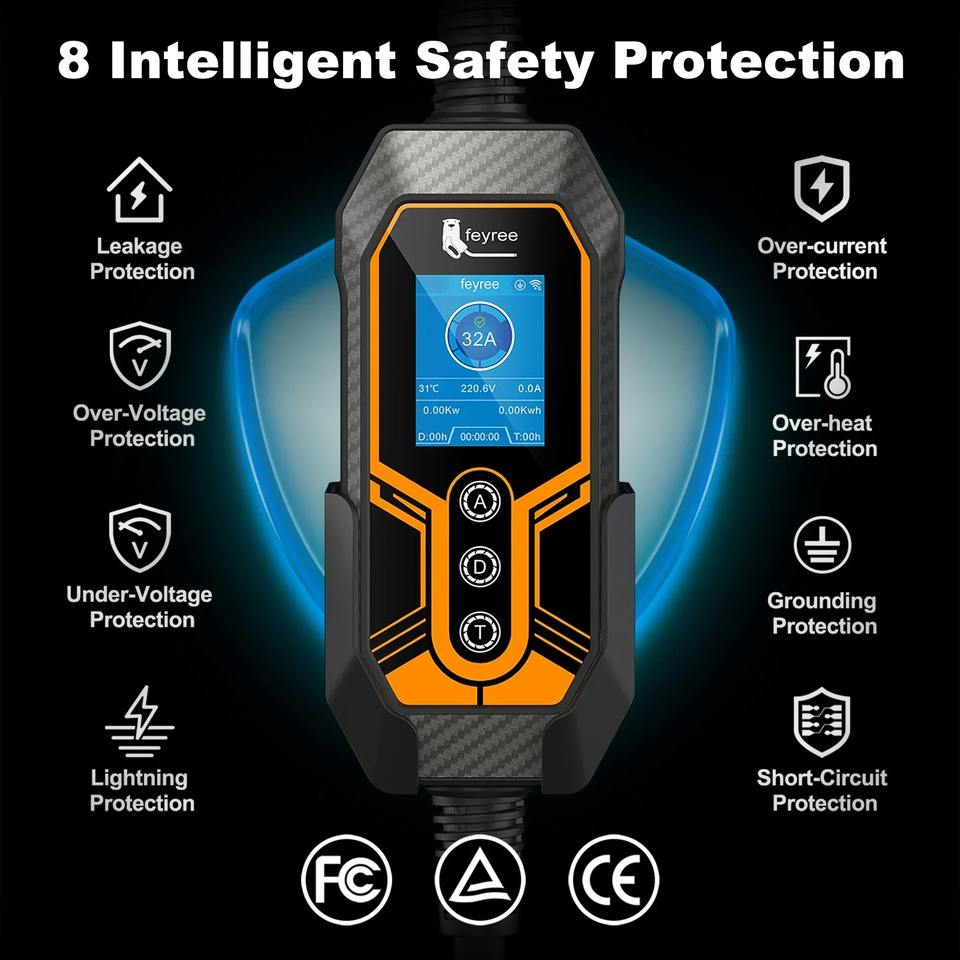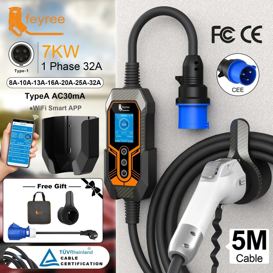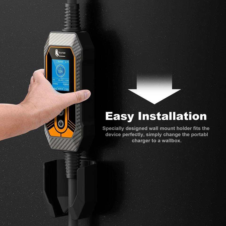 เครื่องชาร์จรถยนต์ไฟฟ้าแบบพกพา Feyree GBT รุ่น Phase 1 7kW 32A พร้อมที่ยึดติดตั้ง รองรับการตั้งเวลาชาร์จผ่านแอป Smart WIFI