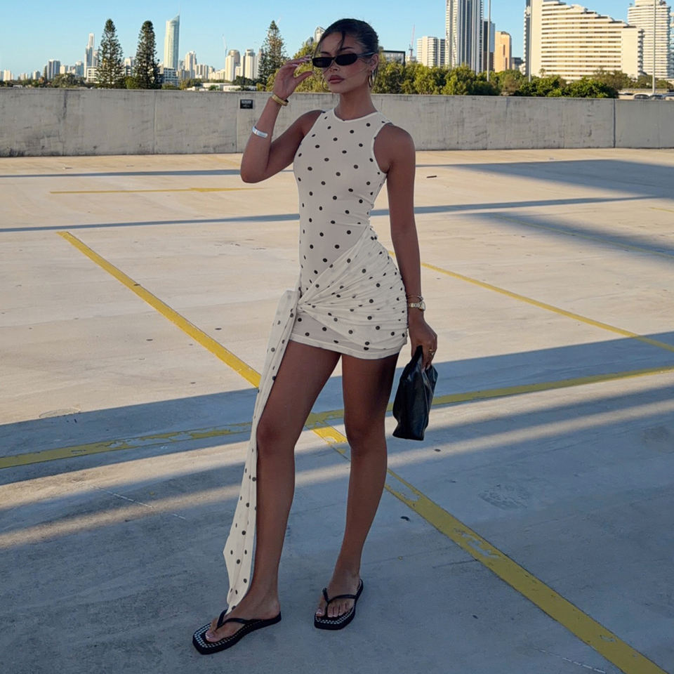เดรสสั้นทรงเข้ารูปผ้าพลีทลายจุดสไตล์ฝรั่งเศสสุดหรูหราเซ็กซี่แบบไม่มีแขนพร้อมสายผูกโบว์