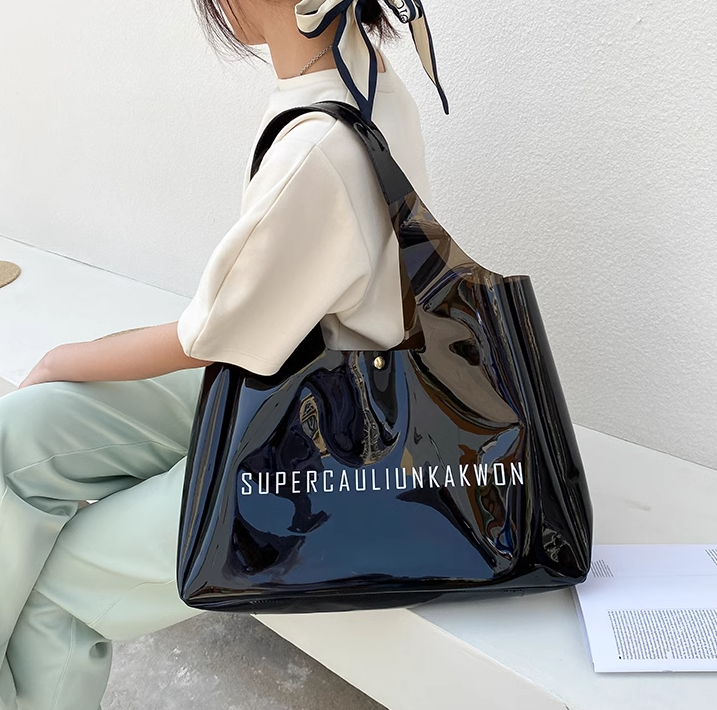 ถุงช้อปปิ้งพีวีซีสีดำเข้มพร้อมกระดุมออกแบบโลโก้ได้ตามที่ต้องการพร้อมด้วยด้ามจับนุ่มด้ามจับทำจาก PU