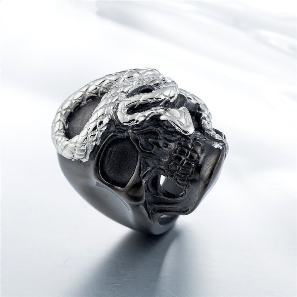แหวนสแตนเลสสตีลรูปหัวกะโหลก 'here I Go Again' แหวนลายงู ดีไซน์ใหม่ปี 2026 สีดำแบบโครงกระดูก รับสั่งทำสีตามต้องการ ไม่มีประดับเพชร