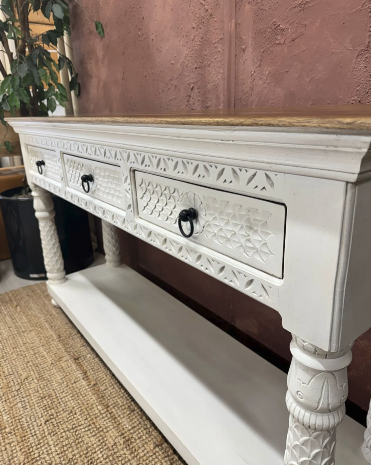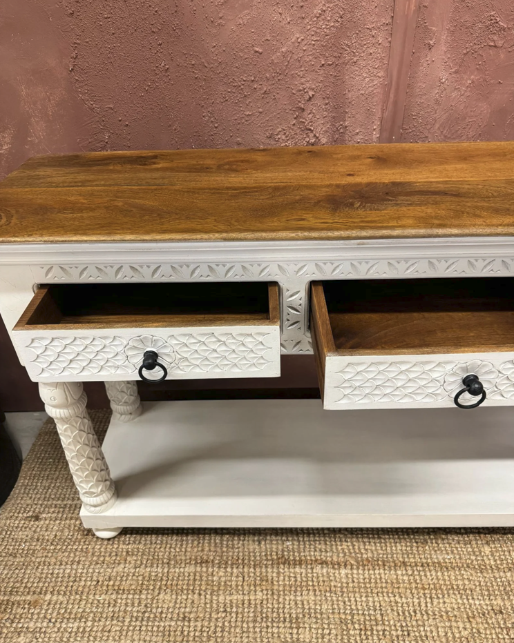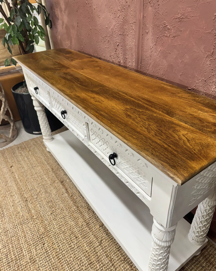 โต๊ะคอนโซลไม้มะม่วงล้างด้วยครีมพร้อมรายละเอียดช่างฝีมือ