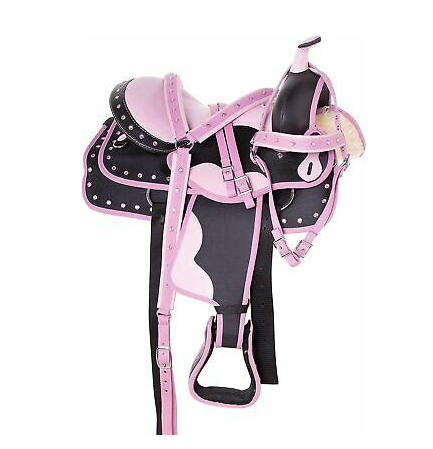 อานม้าหนังแท้ สีชมพูและดำ แบบตะวันตก พร้อมสายรัดปรับได้ นั่งสบาย เหมาะสำหรับการขี่ม้าเทรลและการฝึก