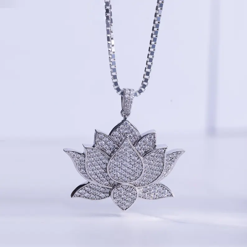 จี้รูปดอกบัวประดับเพชรโมอิสซาไนต์สไตล์ฮิปฮอป สีเงิน ดีไซน์หรูหราสำหรับผู้หญิง เหมาะสำหรับสวมใส่ทุกวัน