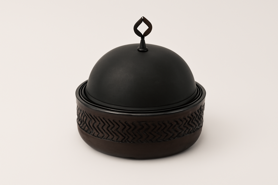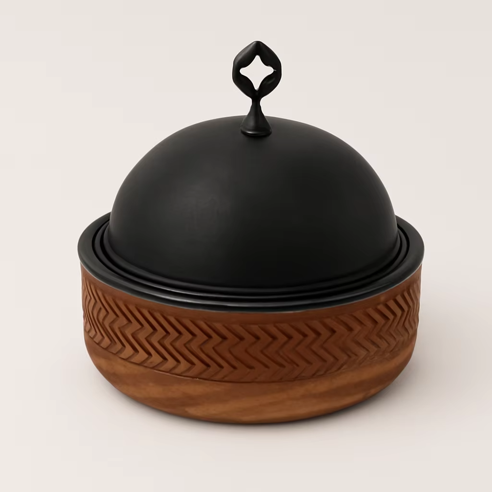 หม้อและหม้อปรุงอาหารทำจากไม้อาเคเซียพร้อมฝาสีดำสำหรับเสิร์ฟสำหรับรับประทานอาหารโต๊ะในบ้าน