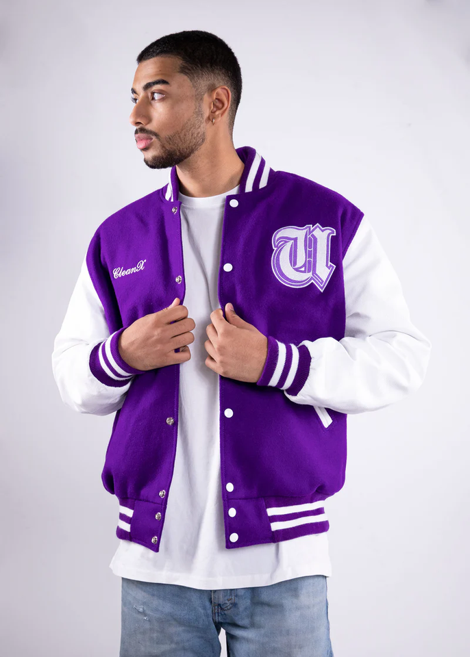 แจ็กเก็ตเลตเตอร์แมนสำหรับผู้ชายแจ็คเก็ตขนแกะสีม่วงแขนสีขาวหนังขนแกะตกแต่งกระดุมถักสำหรับ2023