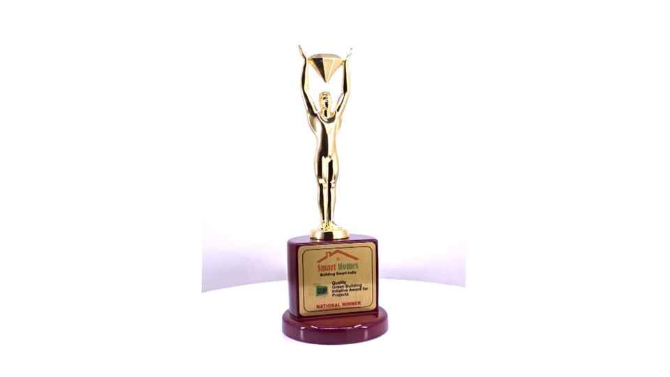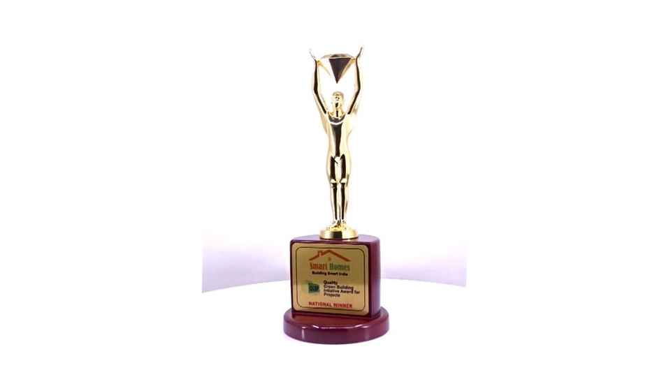 ถ้วยรางวัลรูปคนถือสัญลักษณ์รูปทรงเรขาคณิตเคลือบทองพร้อมฐานไม้เพื่อแสดงถึงความเป็นเลิศ
