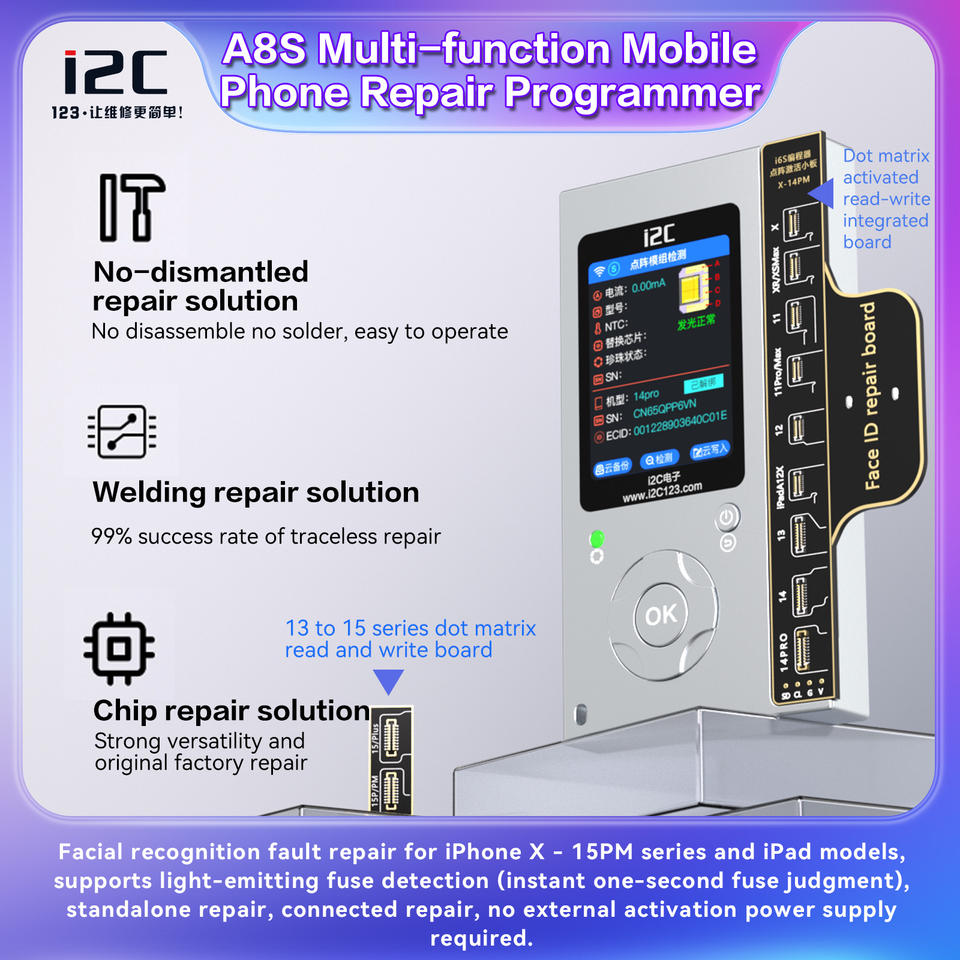 เครื่องโปรแกรมซ่อม i2C A8S รุ่นใหม่ อัพเกรดกล้อง แบตเตอรี่ Face ID True Tone สำหรับ iPhone