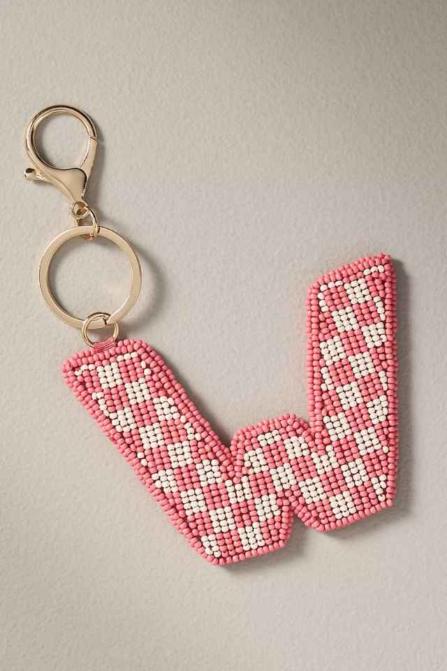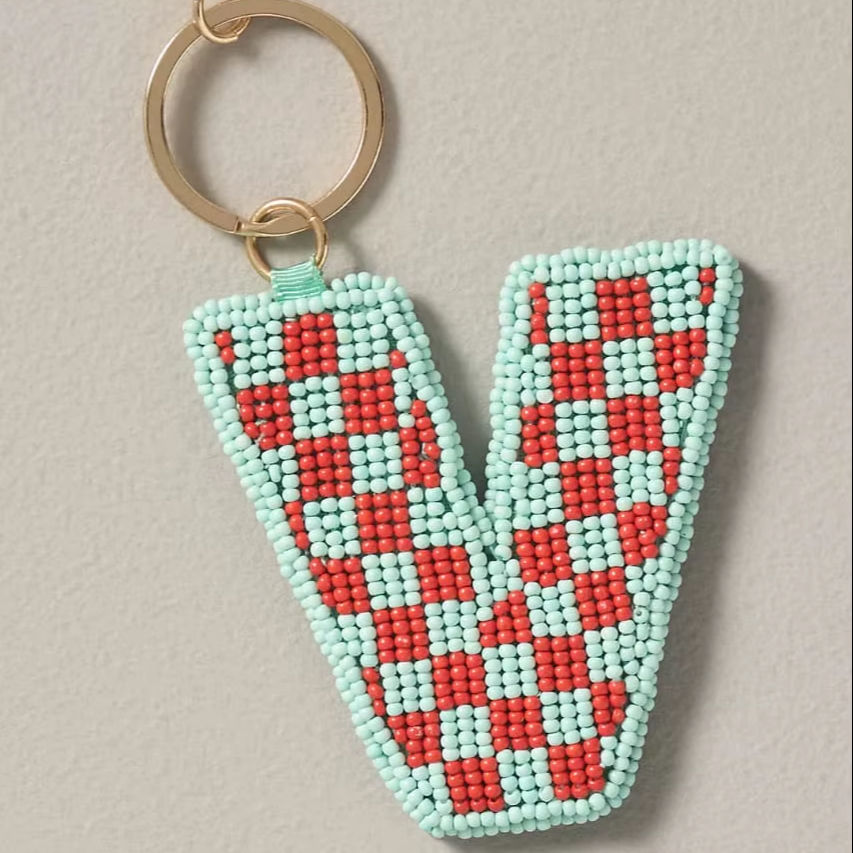 พวงกุญแจรูปตัววีประดับลูกปัดลายตารางสีมิ้นท์คอรัล ทำด้วยมือ ปักด้วยลูกปัดเม็ดเล็ก วงแหวนโลหะสีทอง ของตกแต่งกระเป๋า ของขวัญส่วนตัว