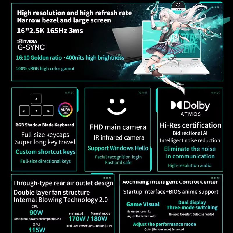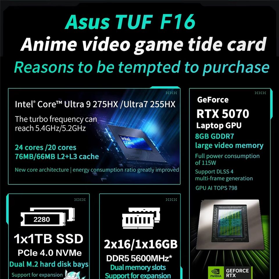 แล็ปท็อป TUF F16 โน้ตบุ๊กเกมมิ่งขนาด 2.5k นิ้ว คอมพิวเตอร์พกพาสำหรับเล่นเกม ซีพียู Core Ultra 9/7 การ์ดจอ RTX5070