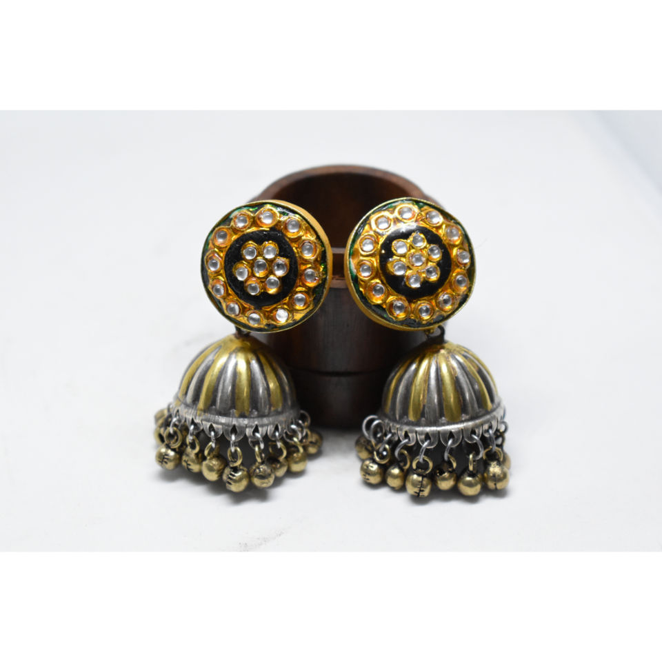 ต่างหูทรงจุมกาแบบห่วงคู่ สีทูโทน ทำมือ ลายมีนาการี ผิวด้าน ทำจากทองเหลือง ประดับด้วยหิน สำหรับเด็กผู้หญิงและผู้หญิง แฟชั่นล่าสุดปี 2025