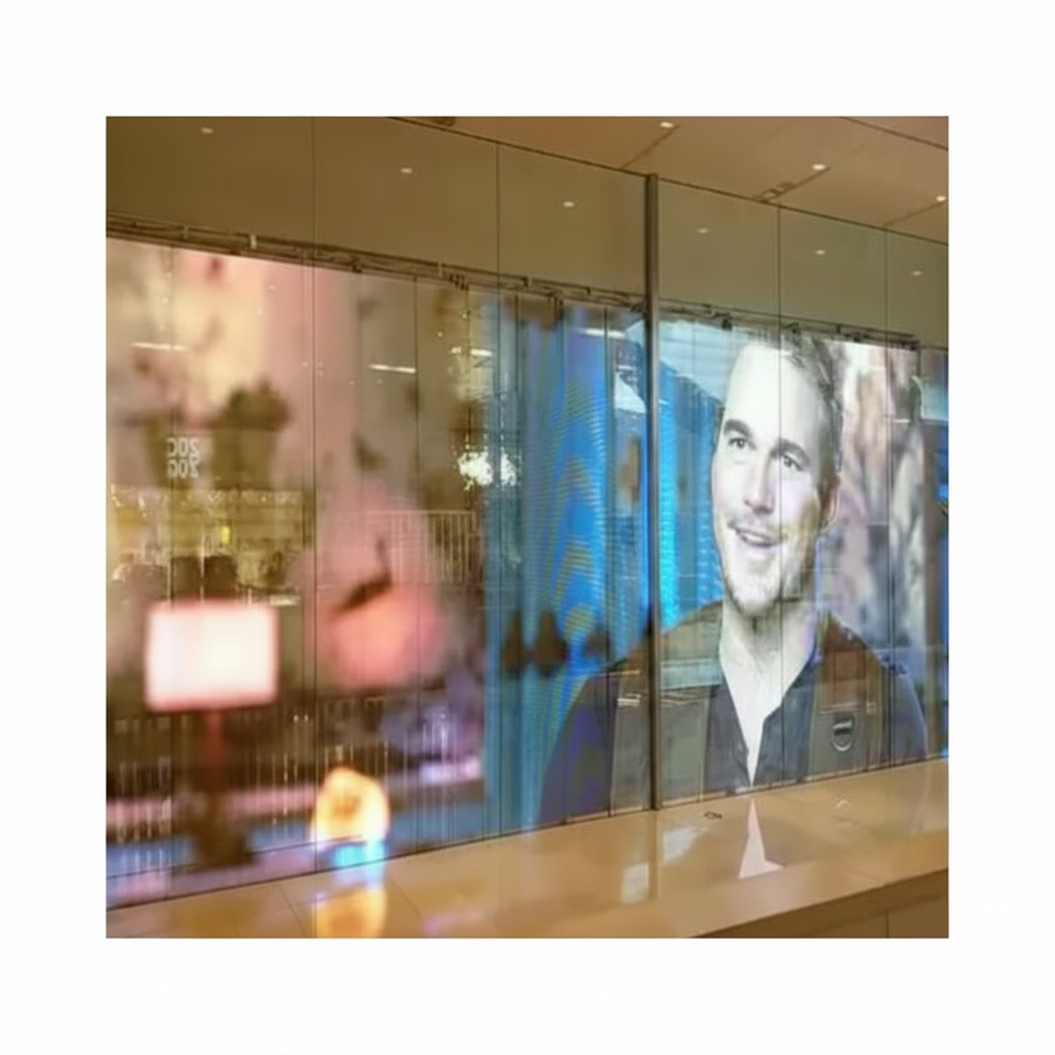 เทคโนโลยีจอ LED P20 จอ LED แบบยืดหยุ่นโปร่งใสสำหรับติดตั้งภายในอาคาร สำหรับหน้าต่างร้านค้า/การโฆษณา