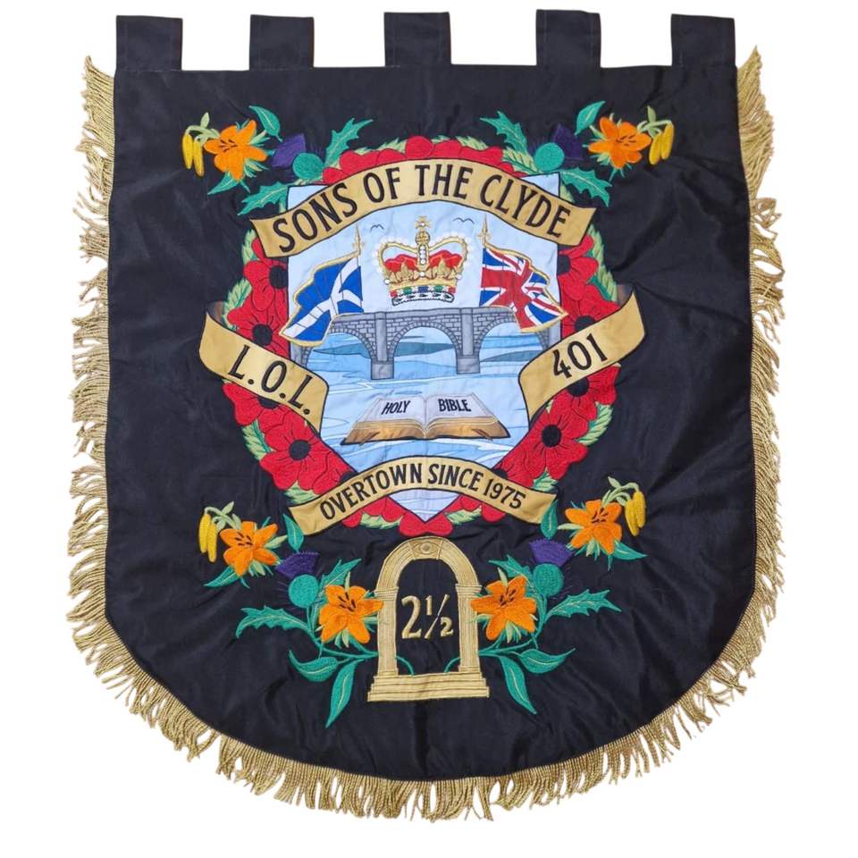 ป้ายประดับตกแต่งขอบด้วยพู่สีทอง ลวดลายดอกไม้ และมีซุ้มโค้งตรงกลาง ป้ายปักลาย