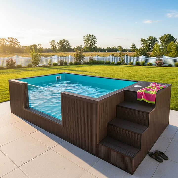 สระว่ายน้ำสำเร็จรูปขนาดใหญ่ 20 ฟุต แบบตู้คอนเทนเนอร์ พร้อมหน้าต่างไม้สั่งทำพิเศษ สำหรับครอบครัว วัสดุไฟเบอร์กลาส ติดตั้งกลางแจ้ง พร้อมสระน้ำวนวนวน ลดราคา