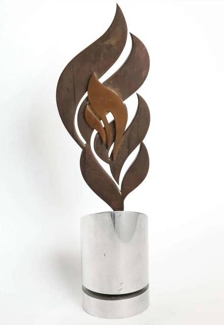 ทำจากอลูมิเนียมสีบรอนซ์และทองเหลืองที่ออกแบบมาเพื่อหมุนรูปปั้นแสดงให้เห็นเปลวไฟสุกใสในประติมากรรมขัดเงาสีทองที่ทันสมัย