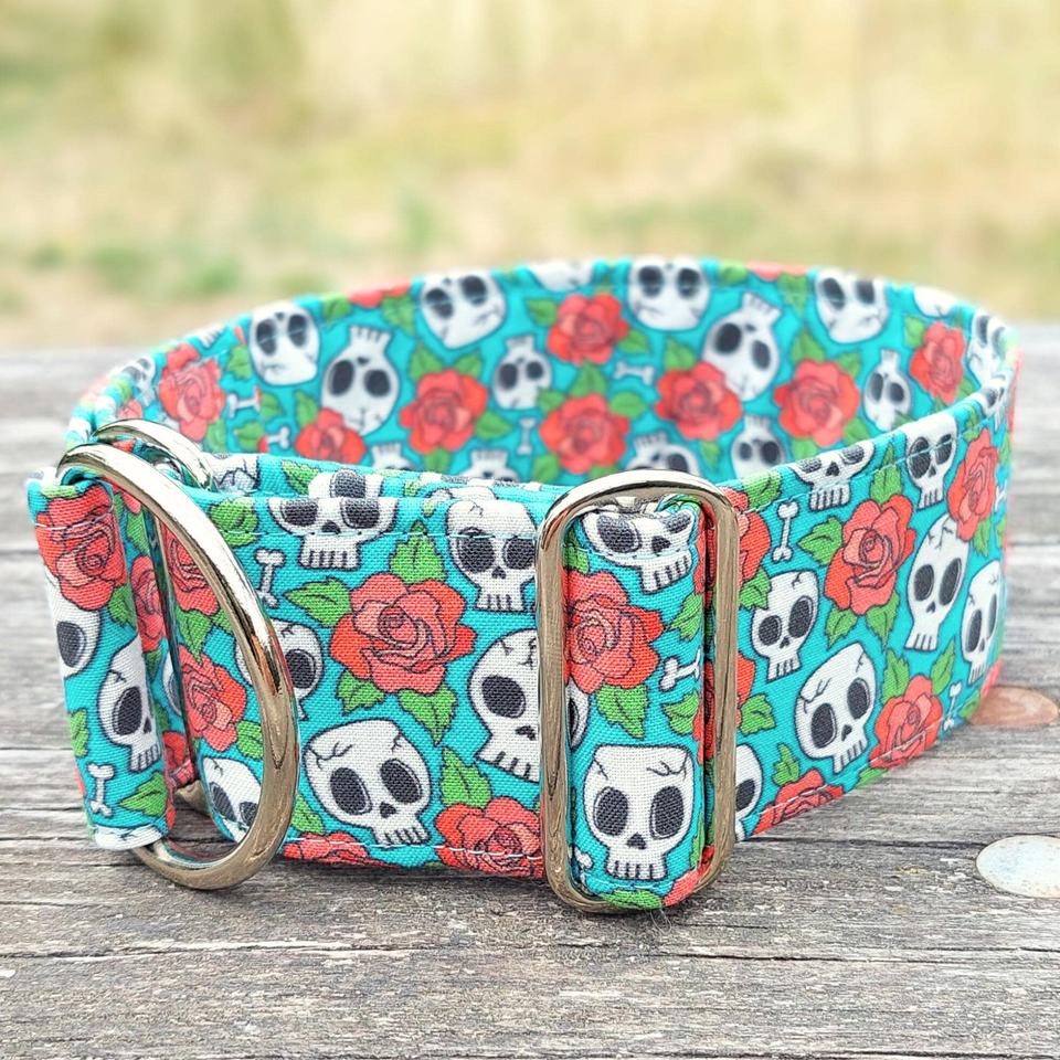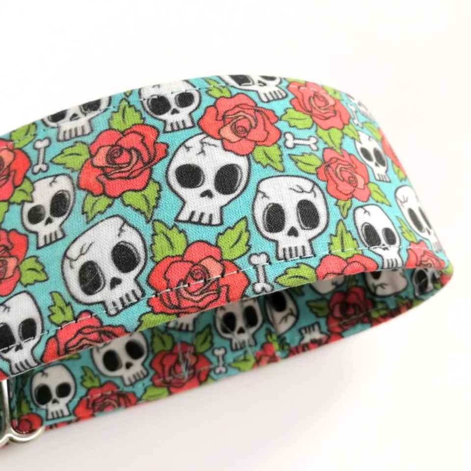 ปลอกคอสุนัขลายหัวกะโหลก & กุหลาบสีฟ้าปลอกคอสุนัขลายฮาโลวีนผ้า Martingale