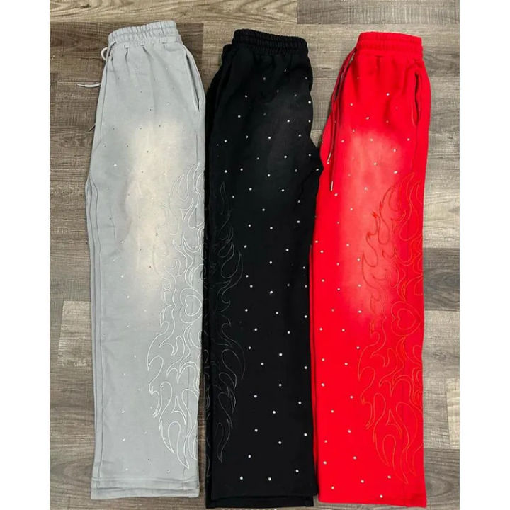 กางเกงขาตรงลายทางโค้งตรงของผู้ชายกางเกงขาบานของผู้ชายปักด้วยพลอยเทียมคุณภาพระดับพรีเมียม100% ออกแบบได้ตามต้องการพิมพ์ลาย