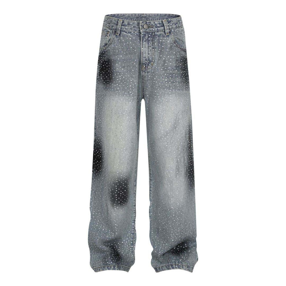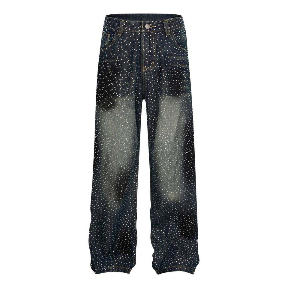 กางเกงยีนส์ผู้ชายทรงตรงลายทางแบบโค้ง แต่งลายตามสั่ง กางเกงทรงหลวมสไตล์สตรีทประดับเพชร คุณภาพสูง ทรงตรง ล้างสีแบบแอซิด