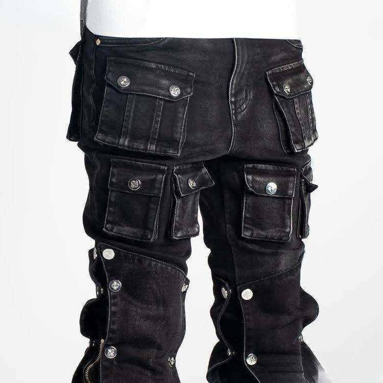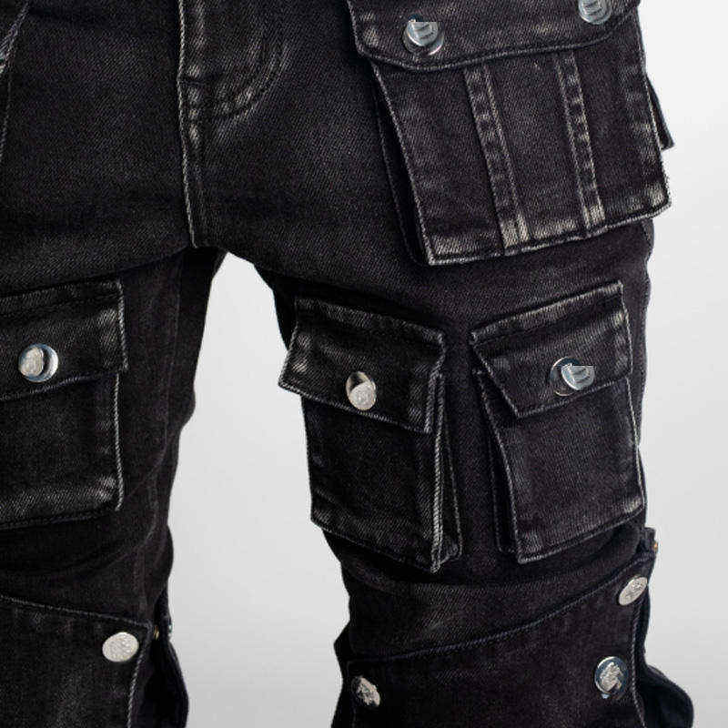 กางเกงยีนส์คาร์โก้สีดำทรงหลวมสไตล์สตรีทสำหรับผู้ชาย มีหลายกระเป๋า แต่งดีเทลขาดๆ แบบมีเลเยอร์