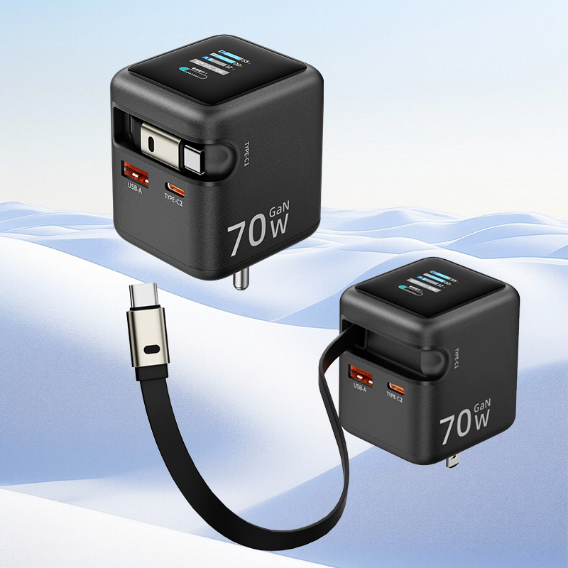 อะแดปเตอร์แปลงไฟแบบเร็ว 70w gan พร้อมพอร์ต usb-c และ usb-a รองรับ qc และ pd พร้อมหน้าจอแสดงผล TFT แสดงแรงดันไฟฟ้า สายชาร์จแบบยืดหดได้ ป้องกัน OTP