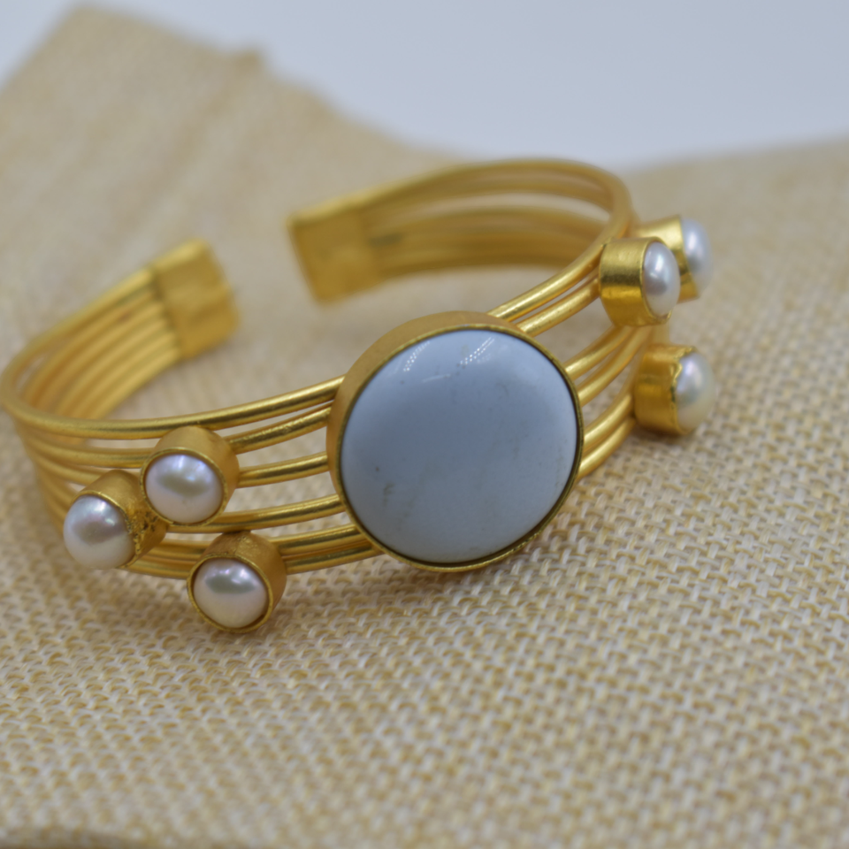 มาใหม่ล่าสุดแฟชั่นมีสไตล์ออกแบบที่ทําด้วยมือทองเหลืองชุบทองสีฟ้าโอปอลหินกึ่งมีค่าลูกปัดสร้อยข้อมือสําหรับเด็กหญิงและสตรี