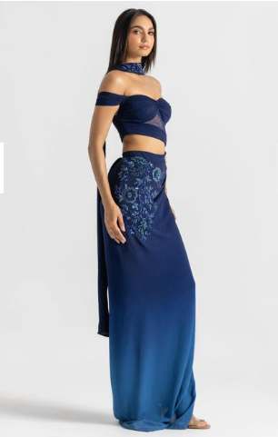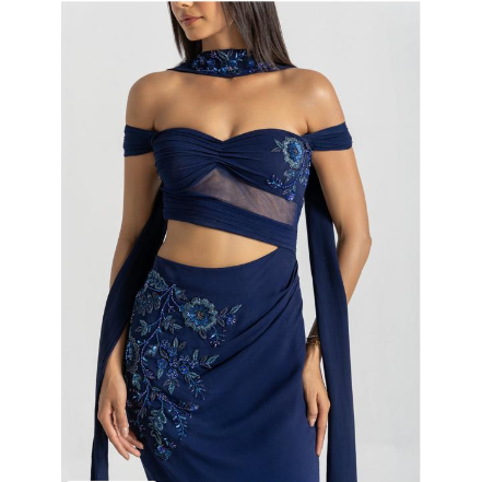 ชุดเดรสผ้าส่าหรีแบบเปิดไหล่พร้อมดีเทลคอแบบโชคเกอร์