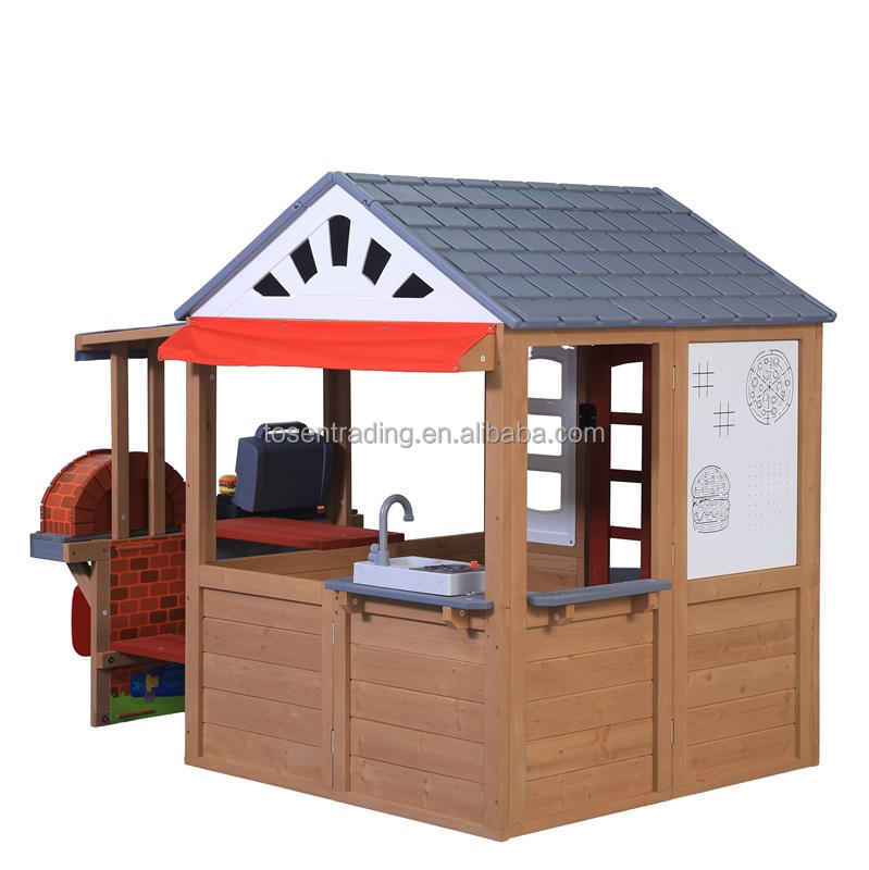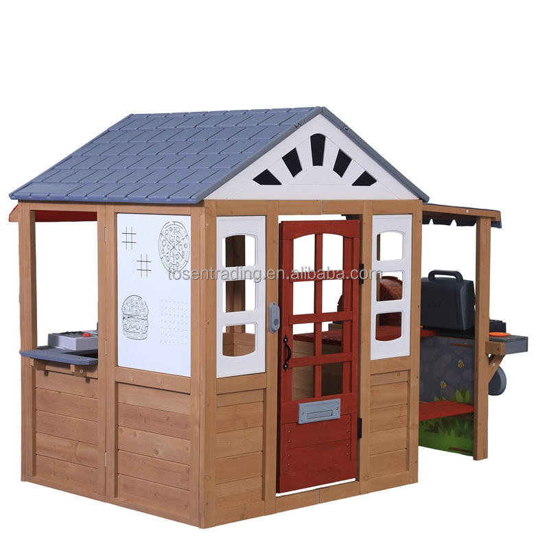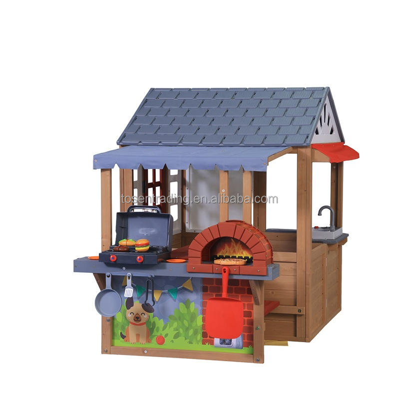บ้านไม้สำหรับเล่นกลางแจ้งพร้อมครัวกลางแจ้ง เตาปิ้งย่าง และเตาอบพิซซ่า - บ้านเล่นจำลองสำหรับสนามหลังบ้าน