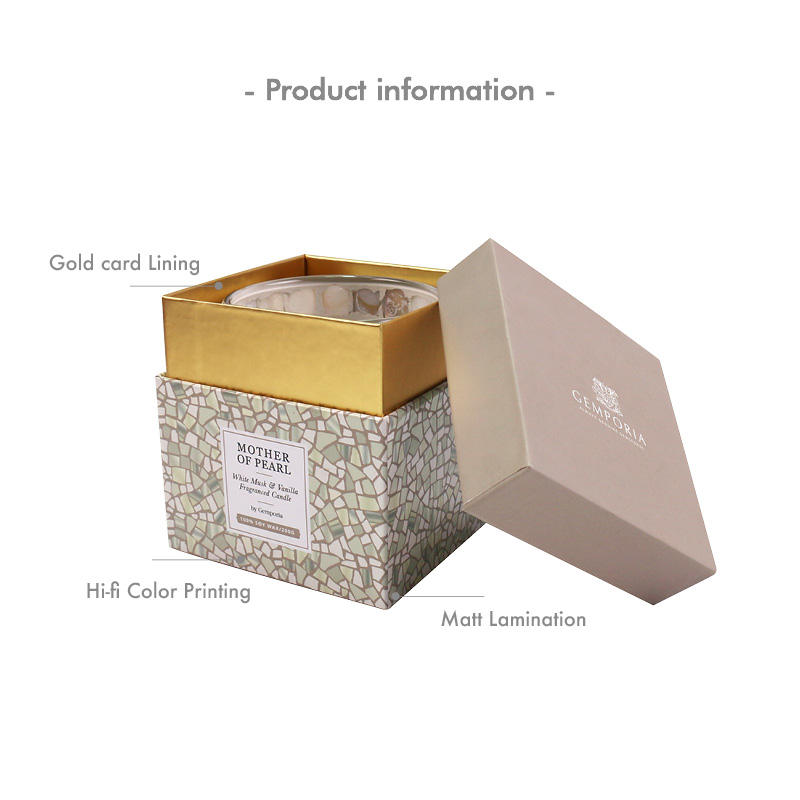 กล่องของขวัญเทียนหอมลายหรูหรา ดีไซน์โดดเด่น ผลิตจากกระดาษรีไซเคิลหนา 2 มม. เคลือบเงา ลายนูน ปรับแต่งได้ ทันสมัย